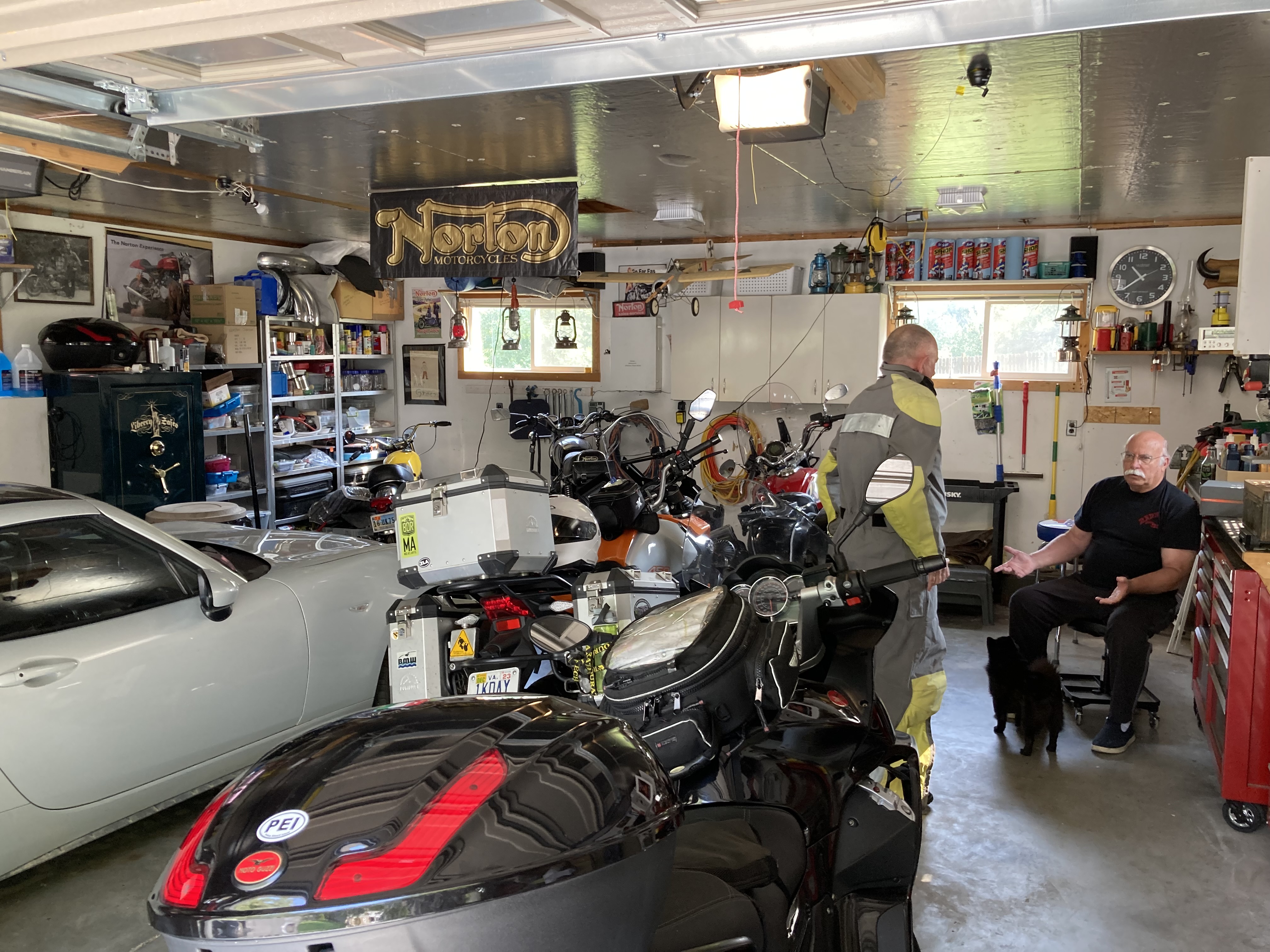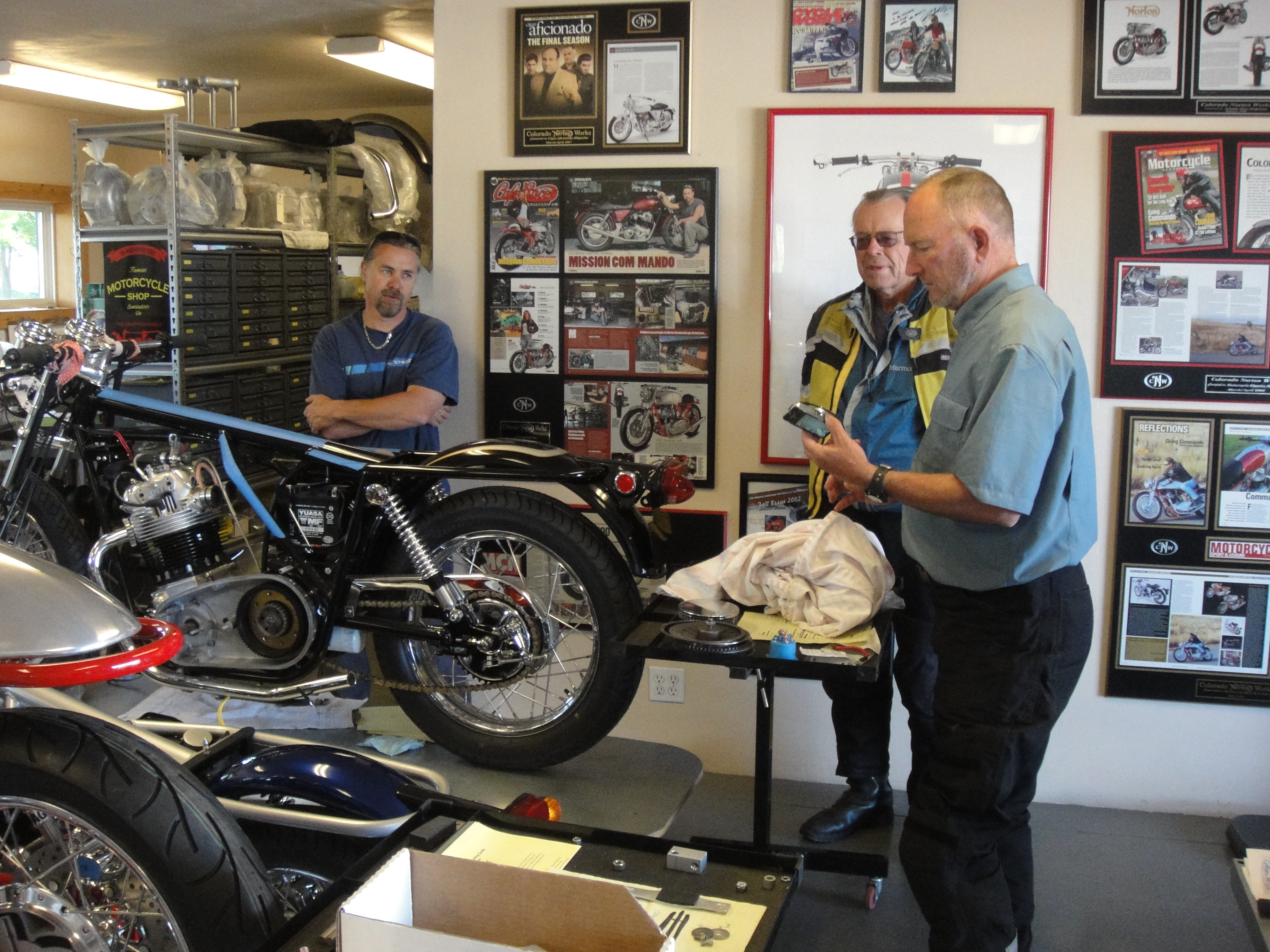 Peter and Mark back in Gar's garage many years later. Gar purchased Mark's 2-valve Moto Guzzi Norge.