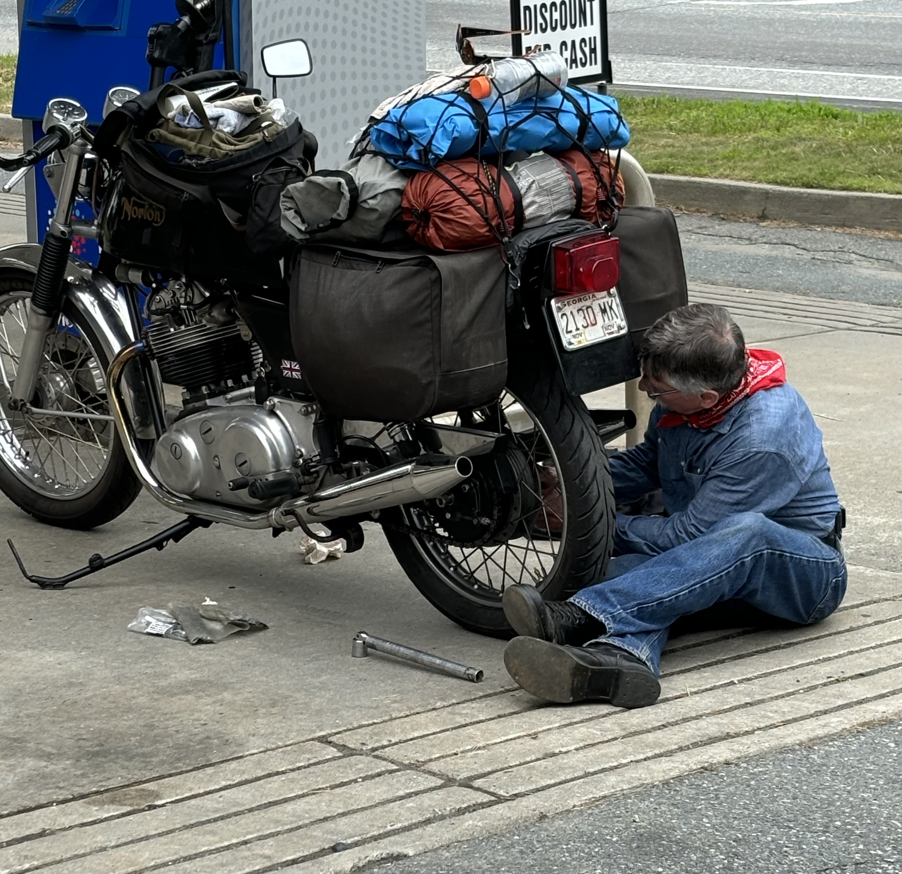 Tom Hill adjusting his chain on the way home from New Hampshire. (2024)