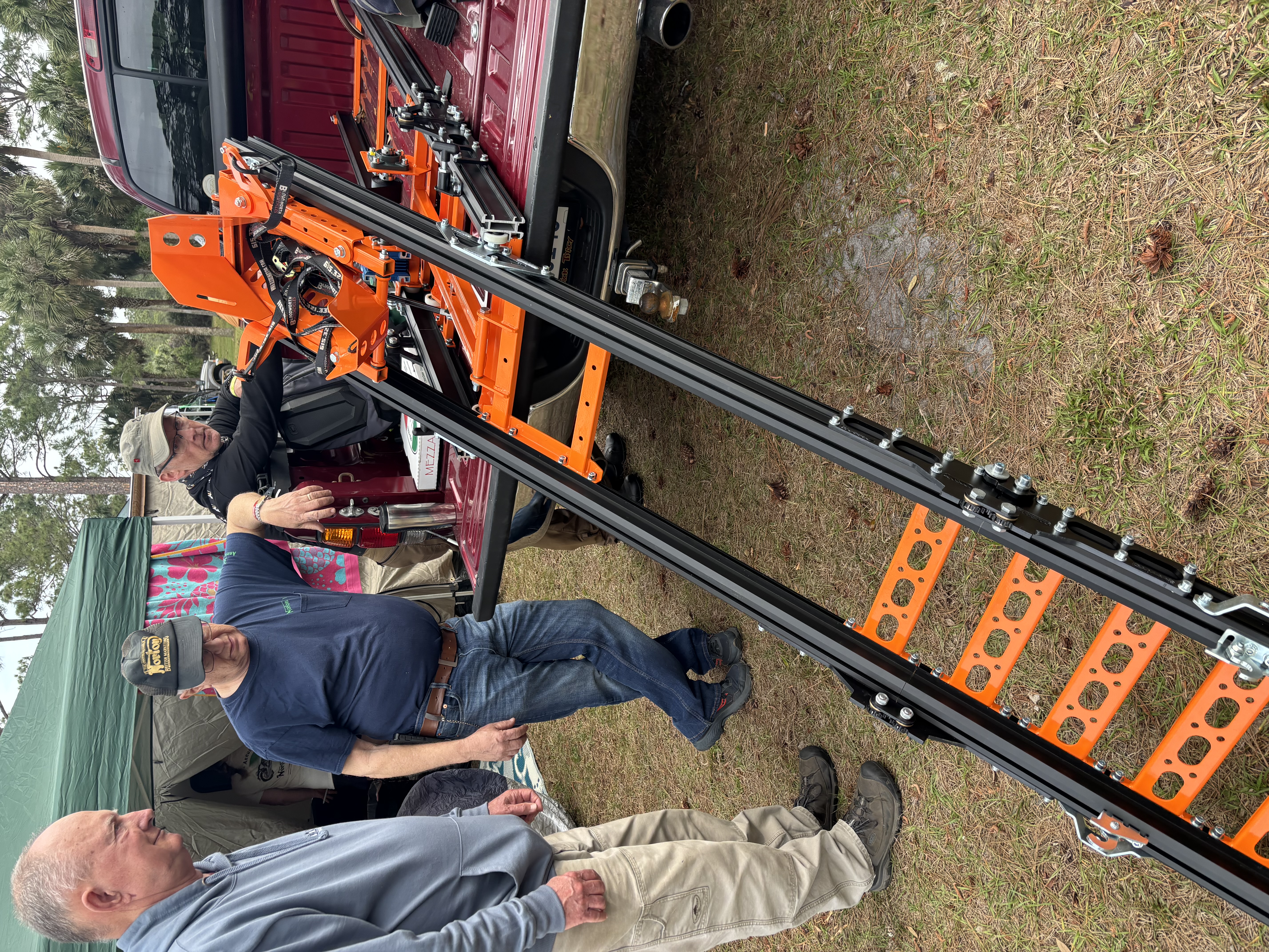 Walt Steele showing Peter and Nathan his cool truck bed motorcycle automatic loader. (2005)
