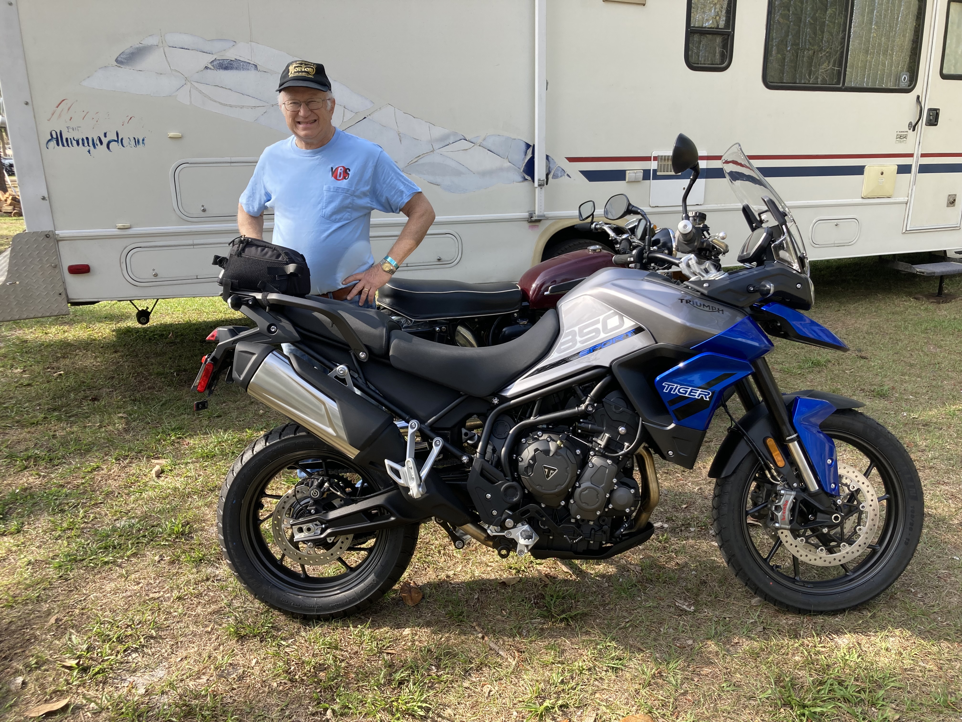 Nathan showing us his brand new Triumph Tiger 850 in the Daytona campground. (2023)